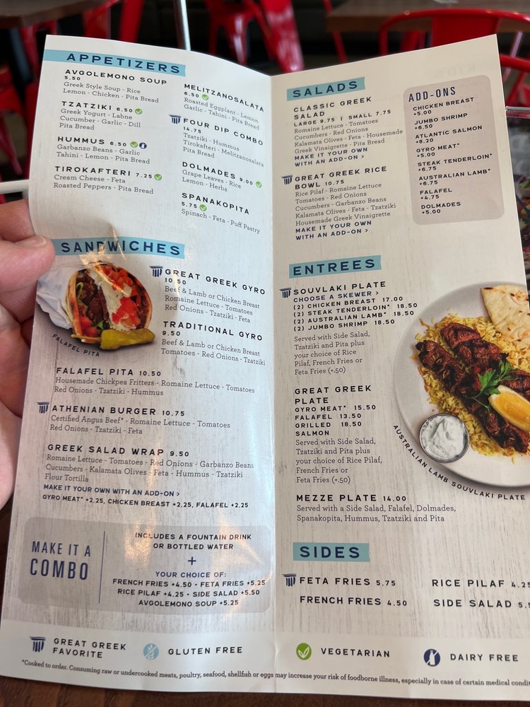 Salads are fresh, with the Small Greek Salad featuring crisp romaine, tomatoes, and Kalamata olives, all served with pita. For heartier fare, the entrees shine: delectable Gyro Plates and succulent Souvlaki skewers promise a satisfying meal for both casual lunches and special occasions.